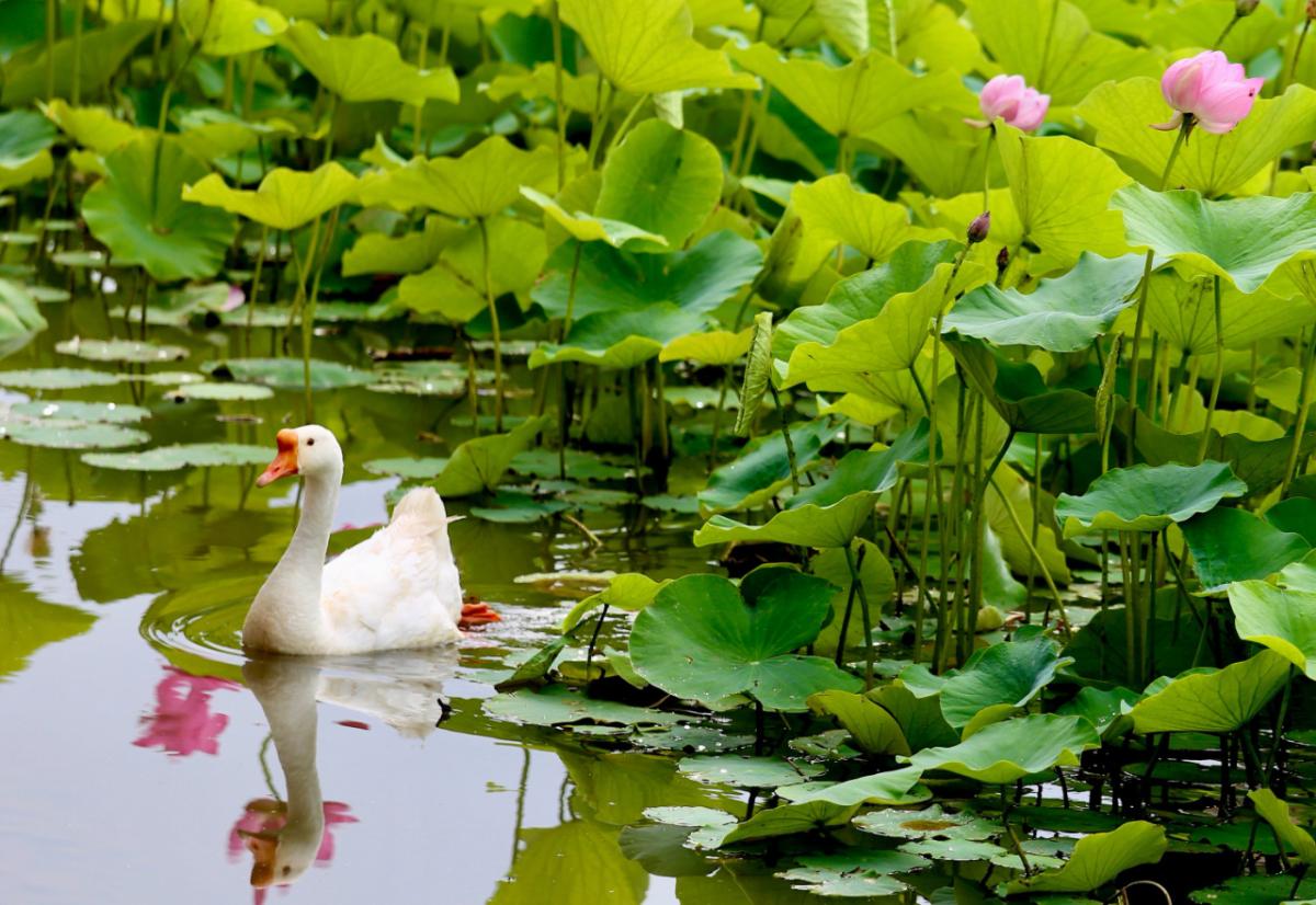放眼望去,荷叶田田,荷花依依,满目的翠绿与娇艳,给炎夏带来了丝丝凉意,更增添了一份诗意与浪漫。微风拂过,荷香四溢,弥漫乡间。池塘边,游人或驻足凝视,或轻移莲步,细细品味着这夏日的美景。