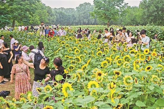 据了解,奥森公园的向日葵种植面积近4万平方米,是北京城区内种植规模最大、品种最全的向日葵观赏区。在这里,游客可以观赏到20余种稀有向日葵,沉浸式畅游花海。本报记者 王伟伟 摄